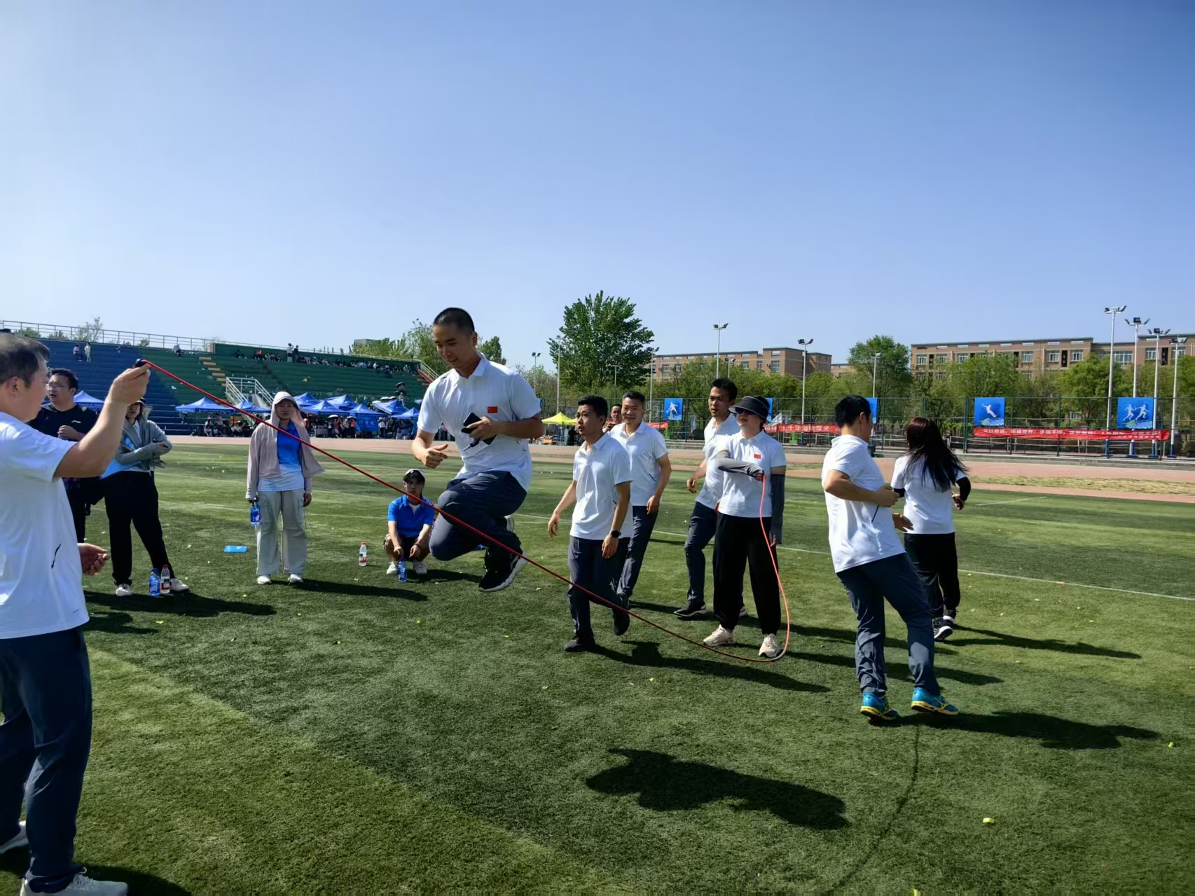 本次运动会中,SUNBET申搏官网的教职工们展现了体育精神和团队协作能力。在定点投篮项目中,能够精准投篮,每一次篮球的入筐都赢得了场边观众的阵阵掌声;背抛实心球比赛中,是力量与技巧的完美结合,展现了不凡的体能与意志力;立定跳远区,一次次飞跃不仅是距离的挑战,更是自我超越的象征。尤为值得一提的是八人跳绳和4×100米接力赛,这两项比赛不仅考验个人的速度与力量,更强调团队合作与默契。SUNBET申搏官网的教职工队伍在这两项比赛中配合无间,以流畅的动作和高速的传递,赢得了现场观众的连连赞叹,充分展现了民航人团结协作、勇于拼搏的精神风貌。此外,“一锤定音”和“众星捧月航天飞机”等趣味比赛项目,更是将运动会的氛围推向了高潮。这些项目不仅增加了运动会的趣味性,也让教职工们在紧张的工作之余享受到了运动的乐趣,增强了团队之间的凝聚力。